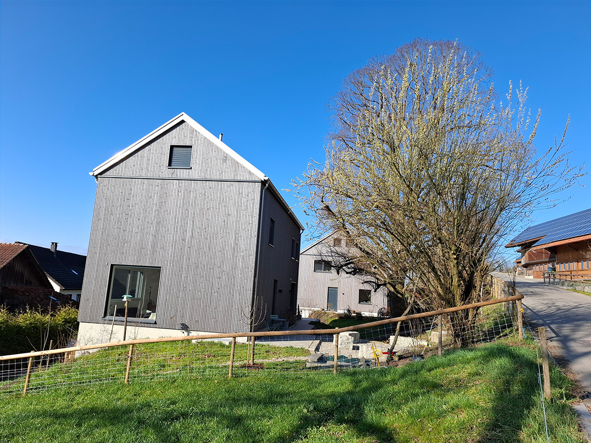 Mit Rücksichtnahme auf die alte, stattliche Linde, konnte die Parzelle mit Hanglage optimal für den Neubau der zwei Einfamilienhäuser ausgenutzt werden. Auf das massive Kellergeschoss wurden die Wohngeschosse als Holz-Elementbau aufgerichtet. Die zwei Häuser fügen sich gut in das Dorfbild von Lustdorf ein.